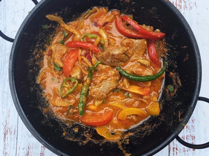 Lamb cooked with onions peppers tomatoes spices in medium korai sauce.