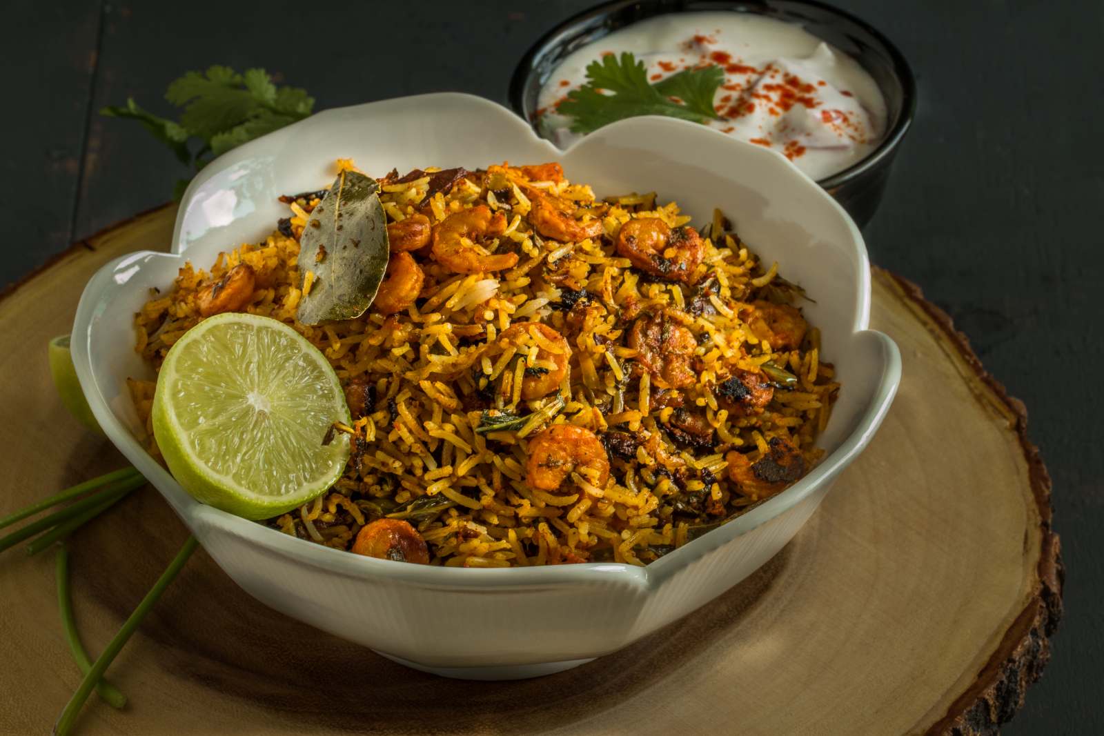 Traditional mixed rice with prawns delicately spiced served vegetable curry.